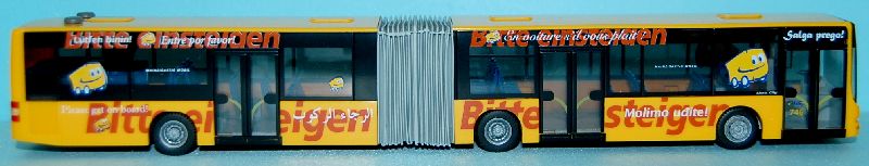 Betrieb: MVG MAN NG 313 Lions City, Eigenwerbung: "Bitte einsteigen" in verschiedenen Sprachen Hersteller: Rietze 67216