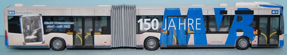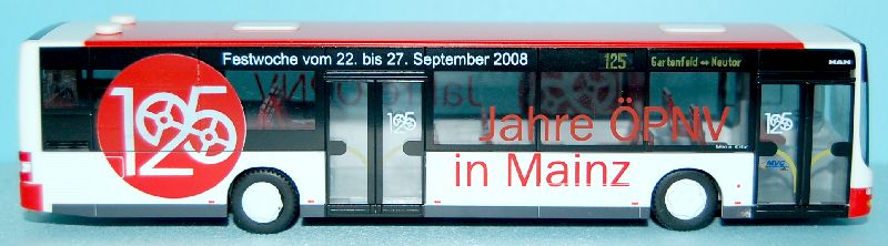 Betrieb: Mainzer Verkehrs Gesellschaft mbH (MVG) MAN Lions City, “125 Jahre ÖPNV in Mainz” (Die Beschriftung gab es so nicht) Hersteller: Rietze (Sondermodell für die MVG)