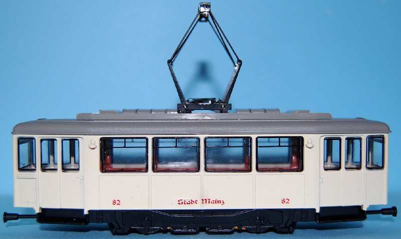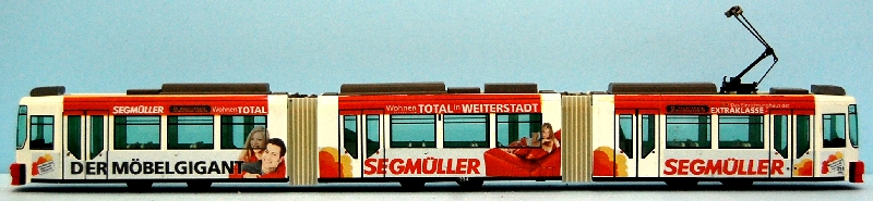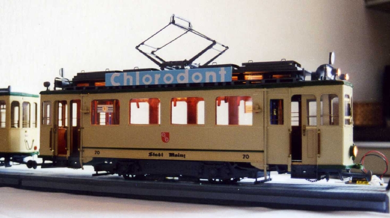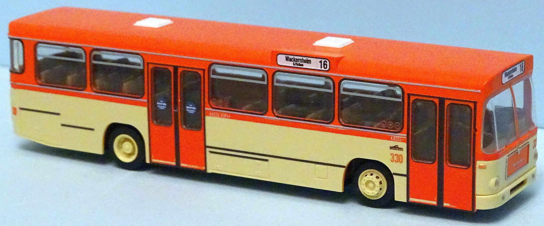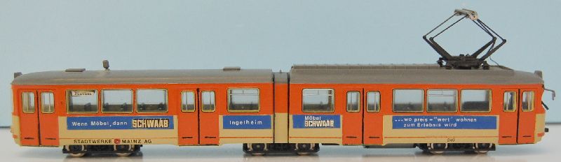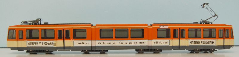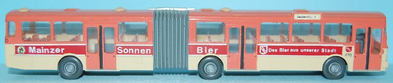 Betrieb: Mainzer Stadtwerke MB O305 G, durch ein Vereinsmitglied mit einer Original Reklame versehen Hersteller: Wiking 705