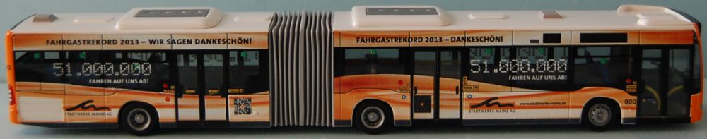 Betrieb: MVG MB O530 Citaro C2 G, Wagennummer “900” “51.000.000 FAHREN...” Hersteller: Rietze 68824 (2014)
