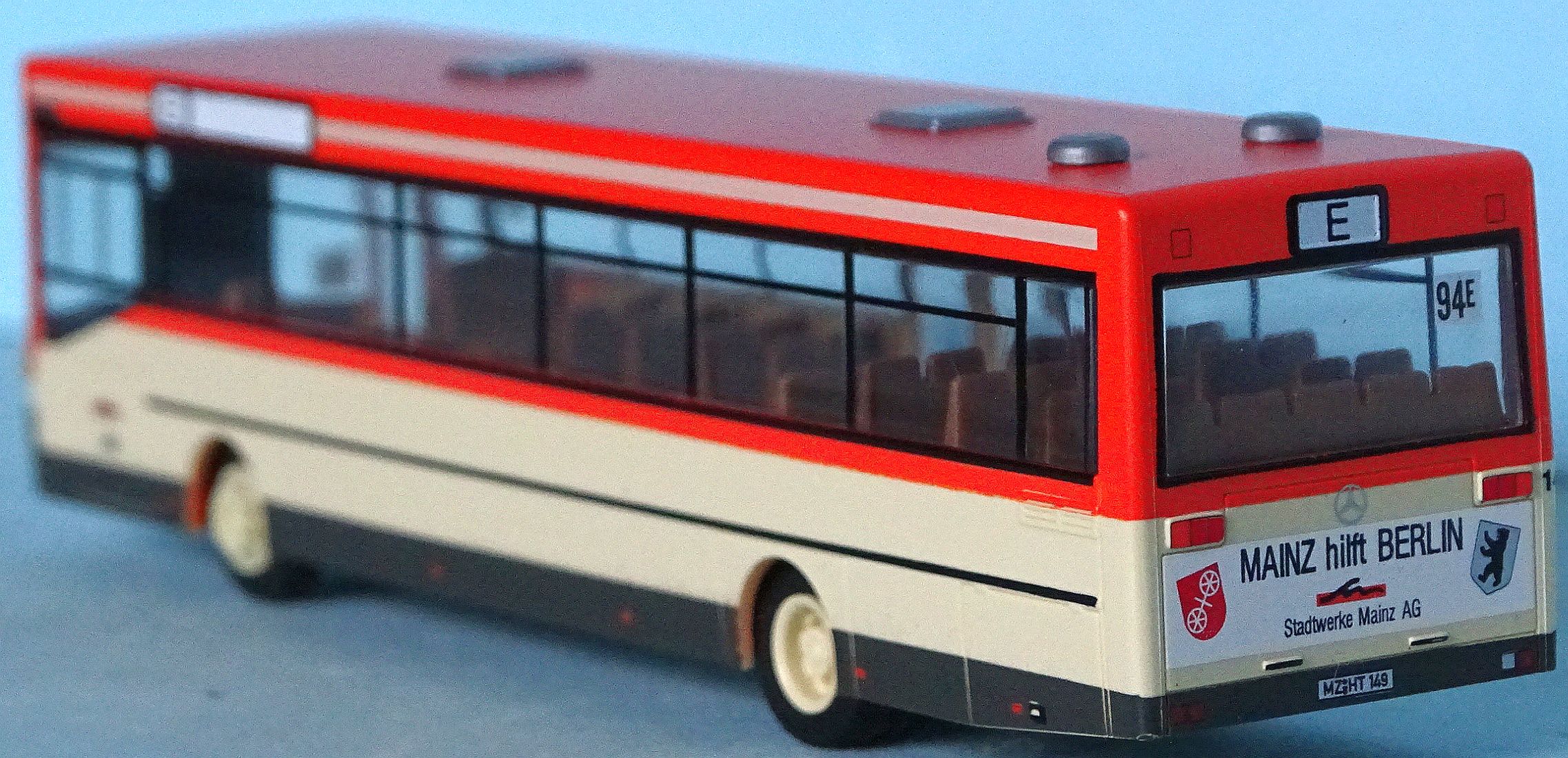 Betrieb: MVG MB O 405, Wagennummer “149” Hersteller: Rietze (Sondermodell, Auflage 150 St.) (2017) Heckaufdruck “MAINZ hilft BERLIN” (Der Wagen war im November 1989 als Solidaritätsbus in Berlin im Einsatz, danach in Mainz Fahrschulbus)