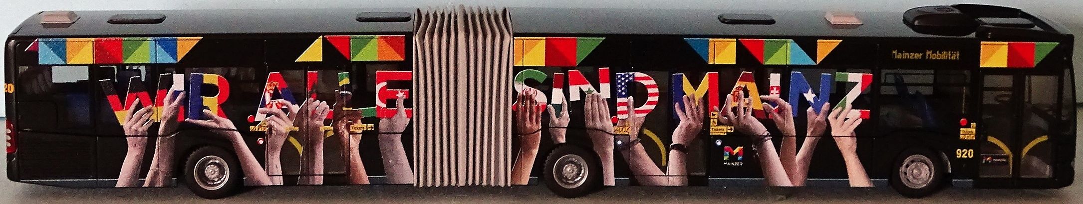 Betrieb: MVG MB O 530 Citaro C2, Wagennummer “920” “WIR ALLE SIND MAINZ” Hersteller: Rietze (Juni/2018) kein Verkaufsmodell. Geschenk an Mitarbeiter bei der Vereinigungsfeier MVG und City-Bus