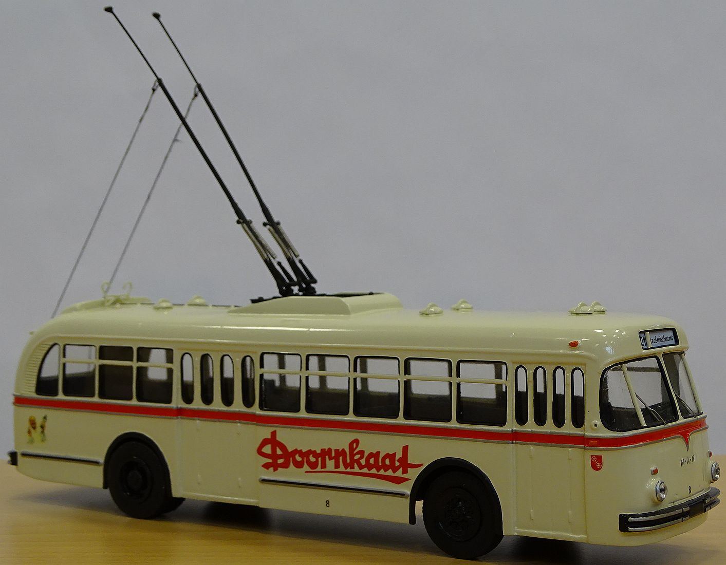 Betrieb: Mainzer Stadtwerke (OBus 8) MAN MKE-2, Beschriftung “Doornkaat” Hersteller: Russmodels Maßstab: 1:43